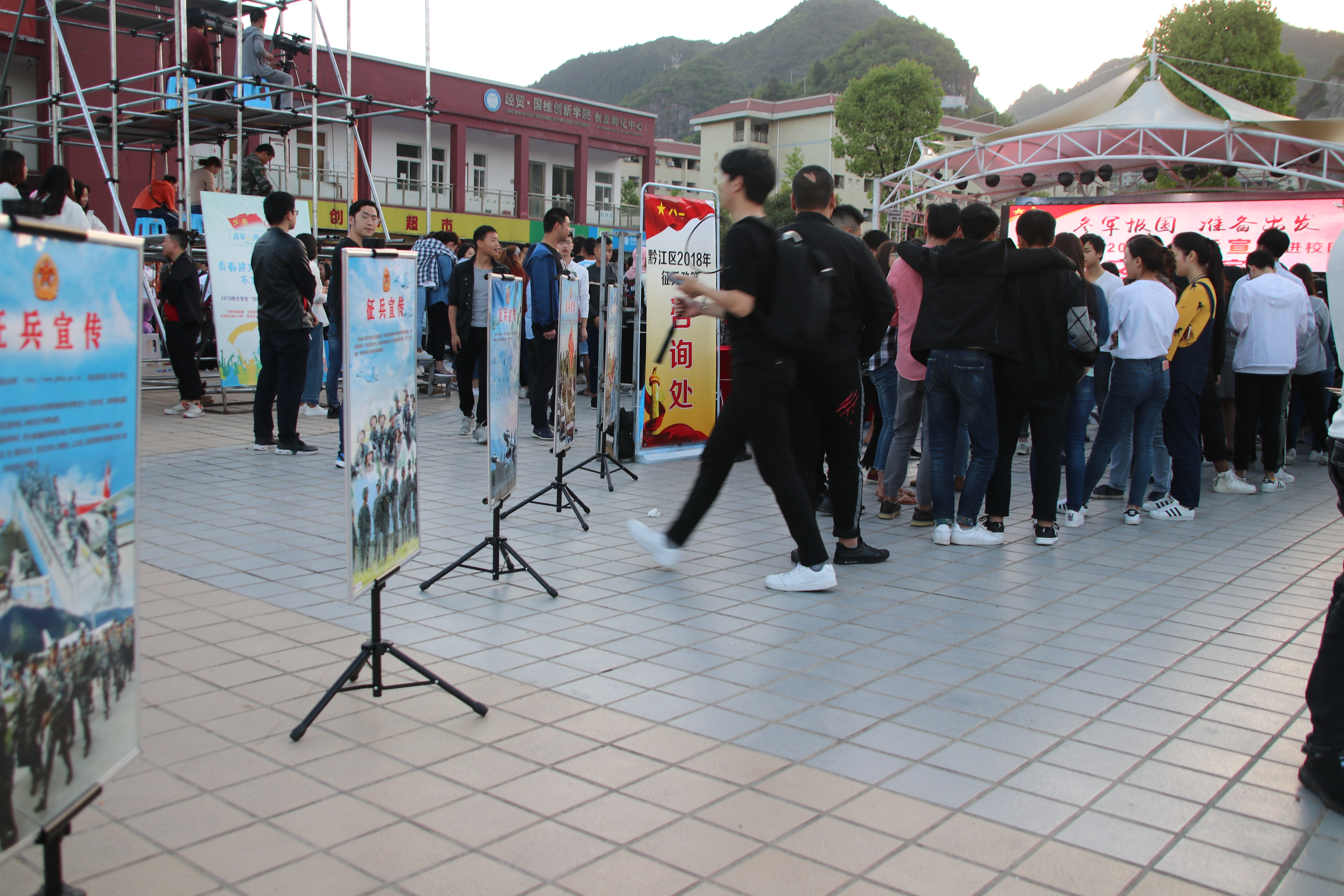 4月18日,由市政府政工办、区委宣传部主办,武警重庆五支队、区音协等协办的“参军报国,准备出发”黔江区2018年征兵宣传进校园文艺汇演在今年会弘毅广场隆重举行。区征兵办杨建华副主任,及区委宣传部、区人武部、区教委等单位相关领导出席了活动,今年会谈建设副院长及各二级学院负责人与千余名师生共同观看了演出。