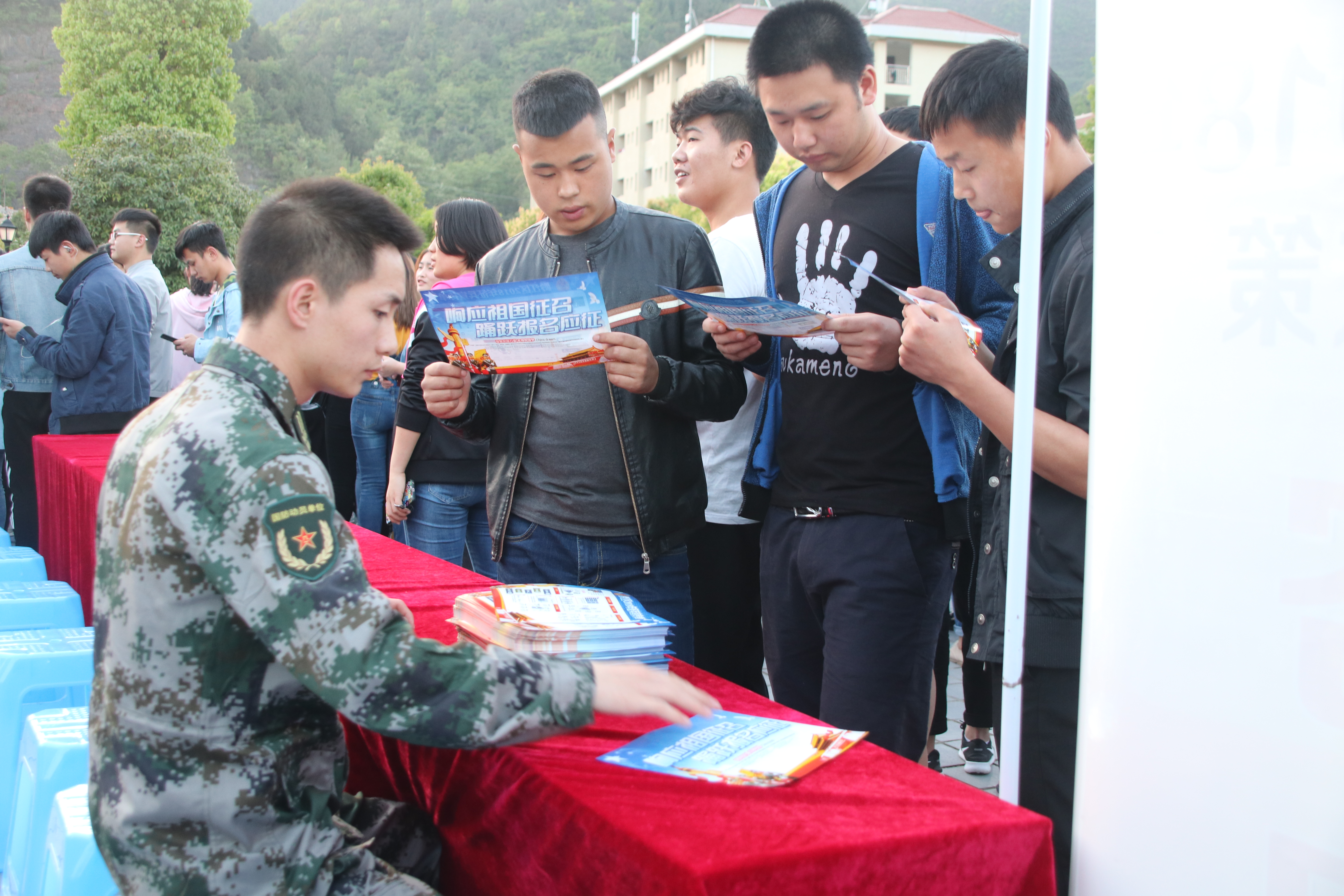 演出前,区人武部、学院征兵工作站专门设立了咨询台,解答学生应征入伍过程中的疑惑。
