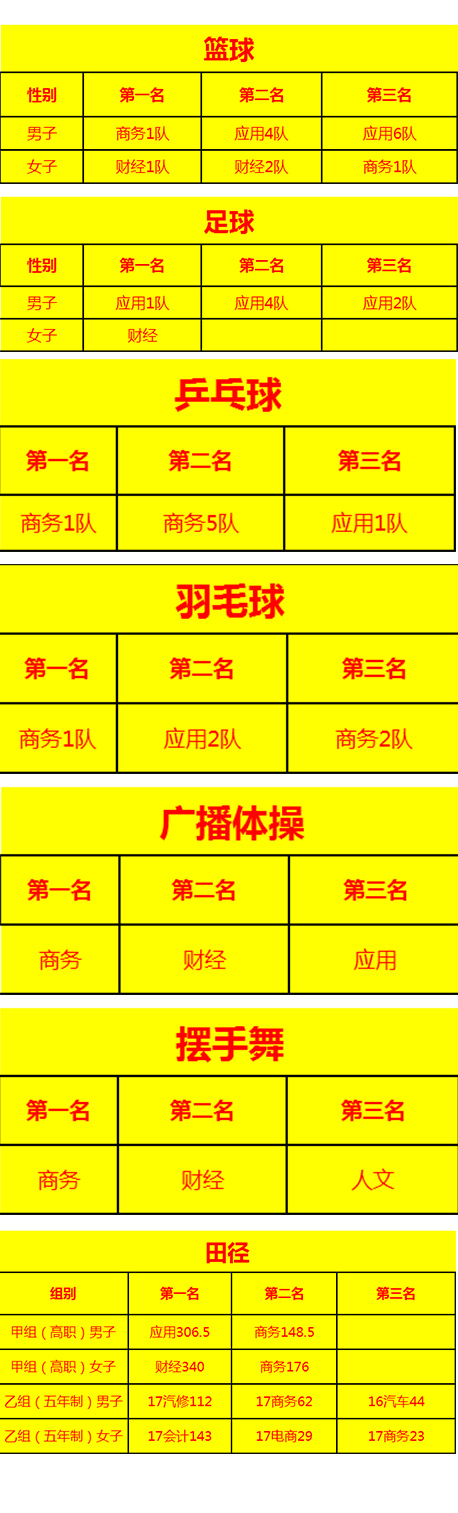 据悉,此次运动会共设了18个大项,55个小项目。且有5个项目7位同学破学校校纪录他们分别是:应用工程学院顾尚映同学以2分13秒47的成绩破甲组男子800米记录;潘佩清同学以1.66米的成绩破甲组男子跳高比赛记录;石胜红以11.6米的成绩破甲组男子三级跳远记录;财经学院李龙燕同学以13秒34的成绩破甲组女子100米记录;钟琴、李龙燕、于宏、潘莉4位同学以55秒22的成绩破甲组女子4*100米记录。