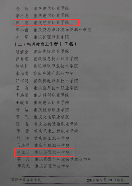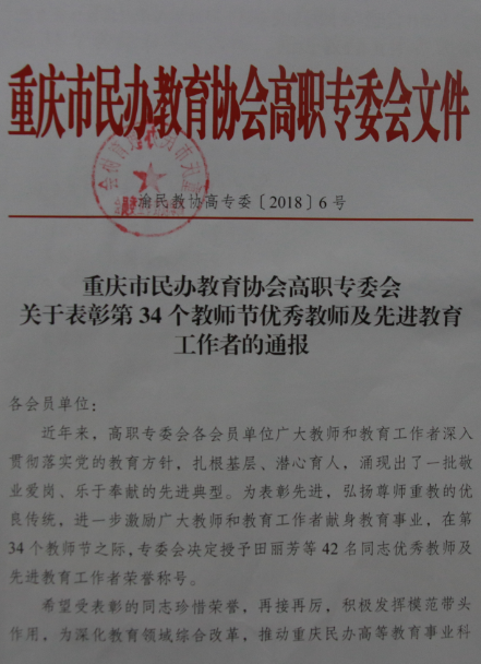 近日,重庆市民办教育协会高职专委员会下发《关于表彰第34个教师节优秀教师及先进教育工作者的通报》,今年会郭鹏老师和赵立旺老师分别荣获“优秀教师”和“优秀教育工作者”荣誉称号。